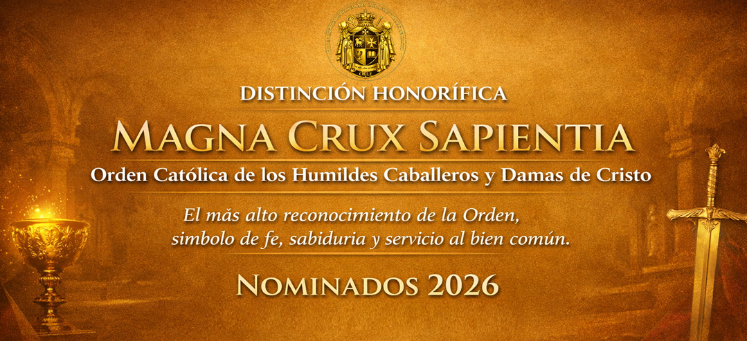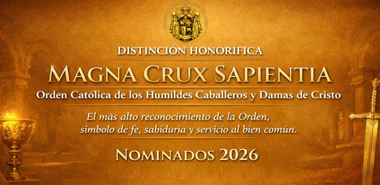 Por su sabiduría, compromiso y servicio, la Orden Católica de los Humildes Caballeros y Damas de Cristo le otorga la Magna Crux Sapientia, como símbolo de reconocimiento a su ejemplo de vida