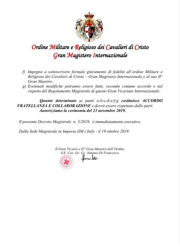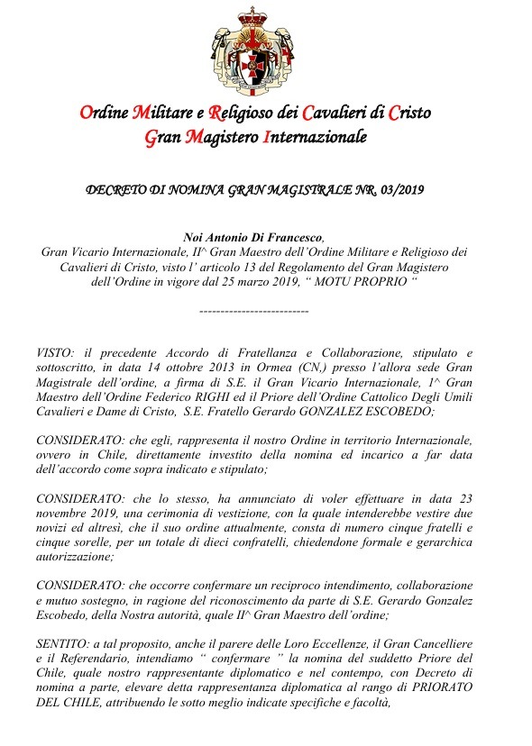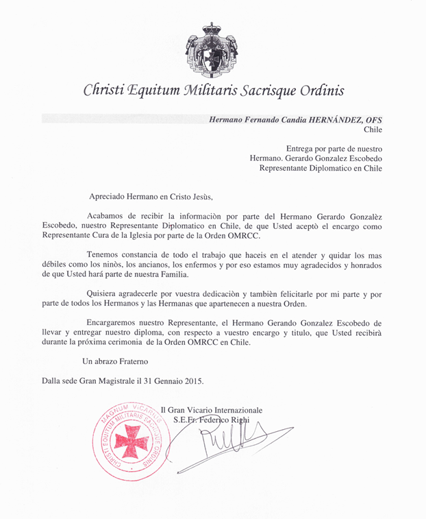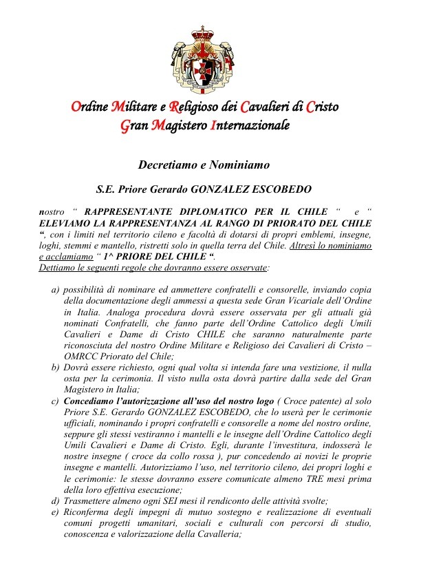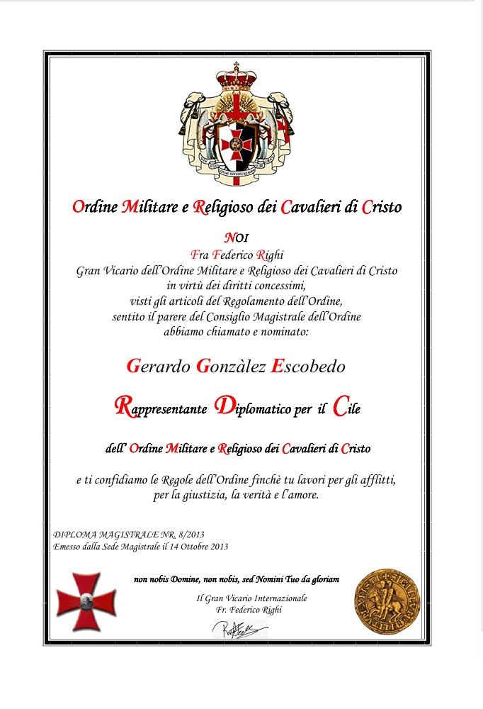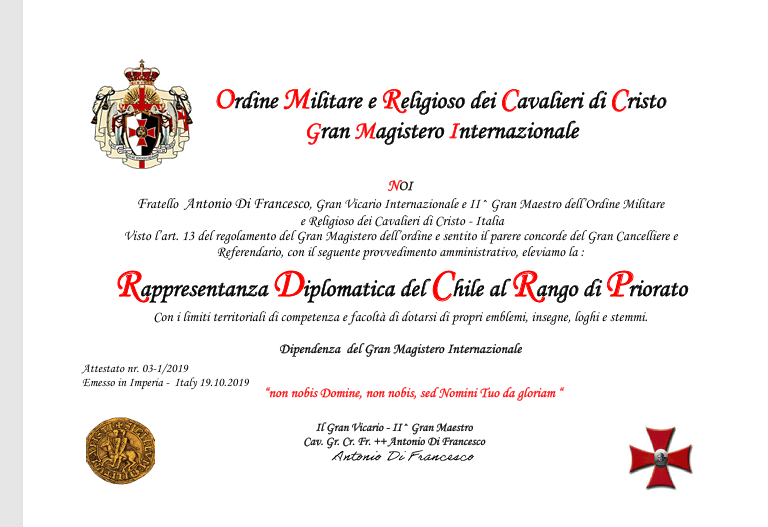 Representante Diplomático para Chile de la Ordine Militare e Religioso dei Cavalieri di Cristo Italia