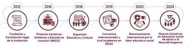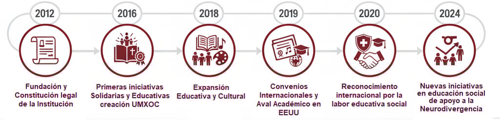 Nuestra Orden nació del llamado a vivir el Evangelio mediante la acción concreta. El 17 de diciembre de 2012 obtuvimos personalidad jurídica como corporación sin fines de lucro, marcando el inicio de un camino de formación integral y servicio social. Durante los primeros años consolidamos proyectos de voluntariado en barrios vulnerables, establecimos alianzas con organizaciones nacionales e internacional y creamos UMX OC para ofrecer educación continua no formal para las personas excluidas del sistema de educación formal. Desde entonces hemos crecido en alcance, comunidad y diplomados, siempre guiados por la fe y la humildad.